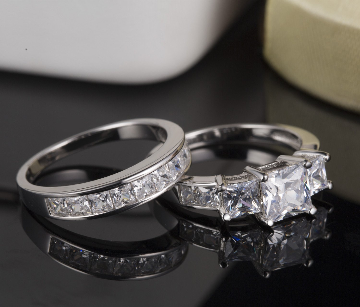 - Women's ring: Three princess cut stone in center with prong setting and come with Matching ring. Men's ring: stainless steel comfort fit design high polish men's wedding band